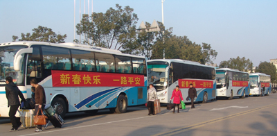 1月31日下午5:30分,五輛(安徽合肥線、安徽六安線、河南鄭州線、江西廣豐線、江西南昌線)貼著:“新春快樂、一路平安”橫幅的長途大客車在東華集團(tuán)自強(qiáng)公司門口一字排開,滿載著250多名老家在這些區(qū)域的員工返鄉(xiāng)過新年。