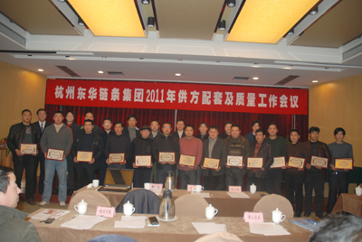隨后,張寶康副總宣布2010年“優(yōu)秀供方”與“特別貢獻獎”供方名單,與會領(lǐng)導(dǎo)向獲獎供應(yīng)商頒發(fā)了證書并合影留念.杭州萬盛精拉絲有限公司崔總作為“優(yōu)秀供方”代表與 杭州三志緊固件軸承有限公司屠董作為“特別貢獻獎”代表上臺作了發(fā)言。