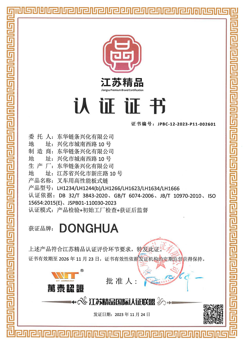 11月,東華板式鏈獲得“江蘇精品”認證。(見下圖)