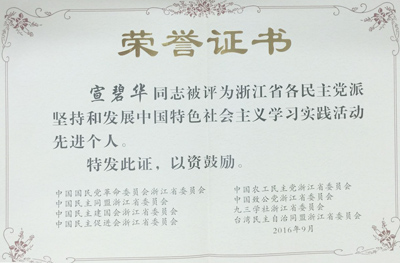 日前,浙江省各民主黨派堅持和發展中國特色社會主義學習實踐活動宣傳展示會在杭州召開。會議共表彰了22位浙江省各民主黨派堅持和發展中國特色社會主義學習實踐活動先進個人,我集團董事長宣碧華榮獲“浙江省民主黨派學習實踐活動先進個人”稱號,成為浙江省民建3位先進個人受到表彰