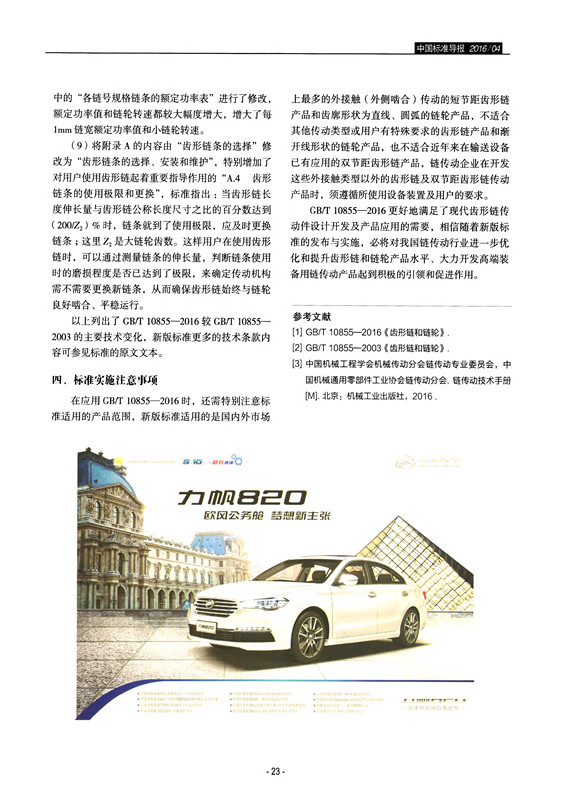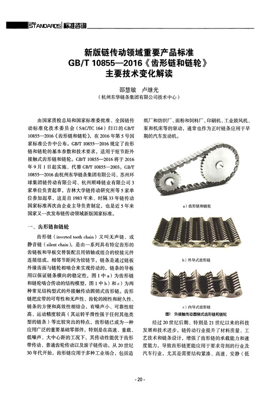 由杭州東華鏈條集團有限公司主持修訂的GB/T 10855—2016《齒形鏈和鏈輪》新版國家標準,自2016年9月1日起實施;這是中國鏈傳動領域近期新發布的一項重要標準。為更好地宣貫好這項新標準,應《中國標準導報》雜志社的約稿要求,東華集團技術中心技術標準化人員撰寫了《新版鏈傳動領域重要產品標準GB/T 10855—2016〈齒形鏈和鏈輪〉主要技術變化解讀》這篇標準解讀論文,已刊登在《中國標準導報》2016年第4期上。下面將這篇論文轉載如下: